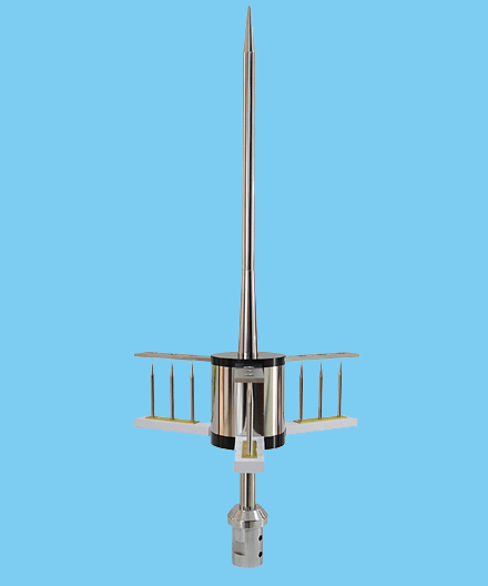 提前放電避雷針主要由激發(fā)器從自然界的電場中吸收并貯存能量,避雷針針尖與大地有良好的電氣連接,處于等電位狀態(tài)。每當(dāng)雷閃發(fā)生前,電場強度會迅猛增大,激發(fā)器與針尖之間的電位差大致相當(dāng)于雷云與大地之間的電位,它們之間的電壓降迅速增加會造成尖端打火,并使尖端周圍的空氣離子化,形成尖端放電現(xiàn)象,從而產(chǎn)生一個早期的上升先導(dǎo)去引導(dǎo),改變雷云的向下先導(dǎo)的走向,將落雷點精確的引到自身上來并迅速、安全地將雷電泄放到大地,避免了傳統(tǒng)避雷針的“繞擊”和“側(cè)擊”現(xiàn)象。